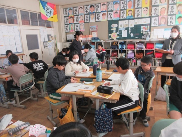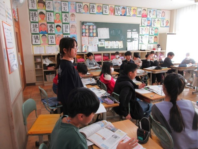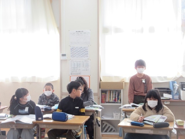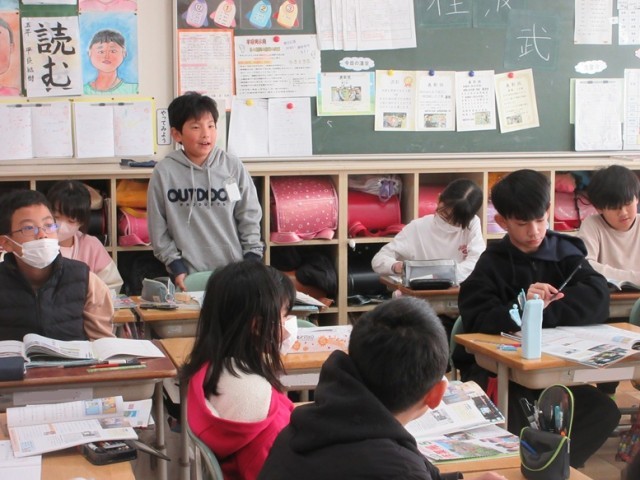 2組は、社会科「放送された情報は私たちにどのよな影響を与えているか」をみんなで考えています。「事前に知ることで対応を素早くすることができる」などの意見が出されていました。