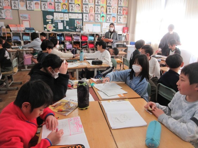 5年1組は、算数「正多角形の性質」をみんなで考えています。角、対角線などのキーワードが出てきました。正八角形の次は、正六角形について考えていきます。