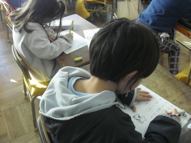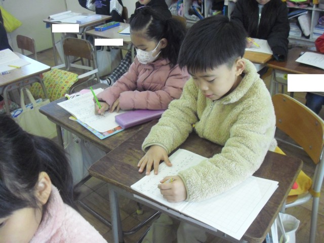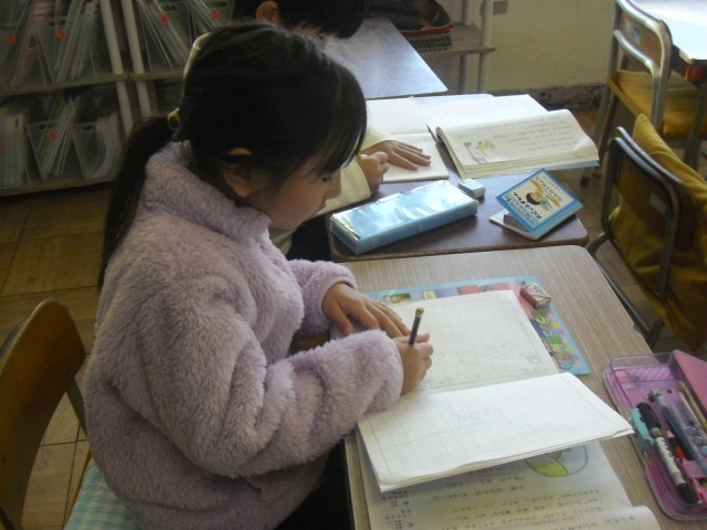 1年1組は国語「おとうとねずみとチロ」の学習です。ノートに文章の大事な箇所を書き写していました。