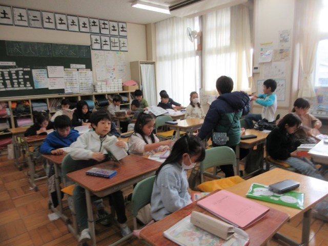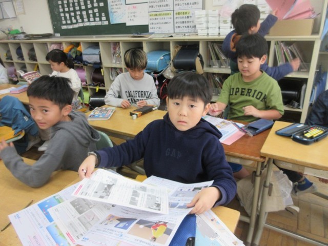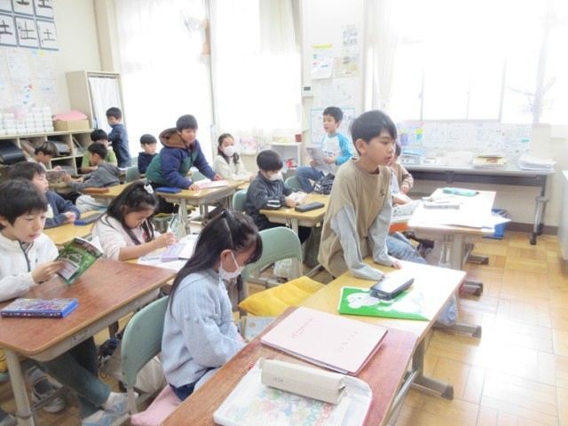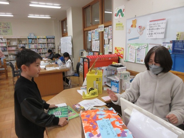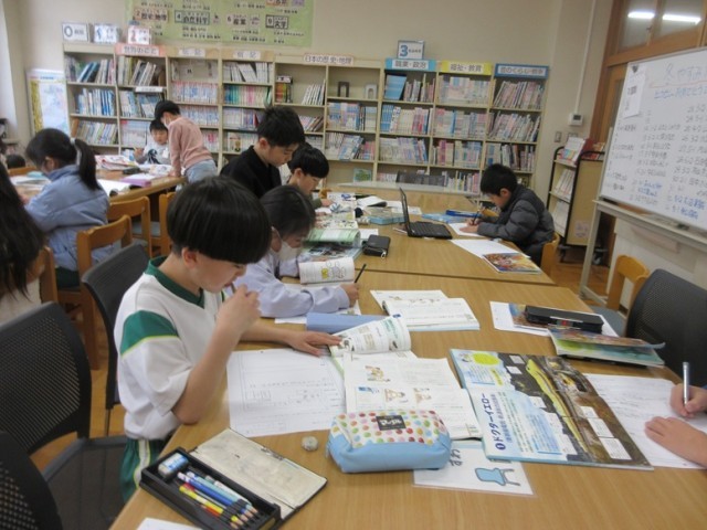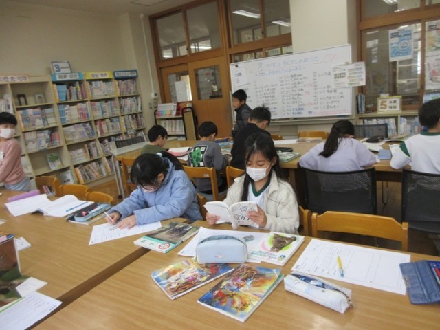 3年1組は、図書館で、国語「本から発見したことを伝え合おう」の学習です。ノンフィクションの本から見つけたことを友達に伝えるためにプリントにまとめています。
