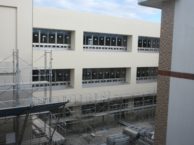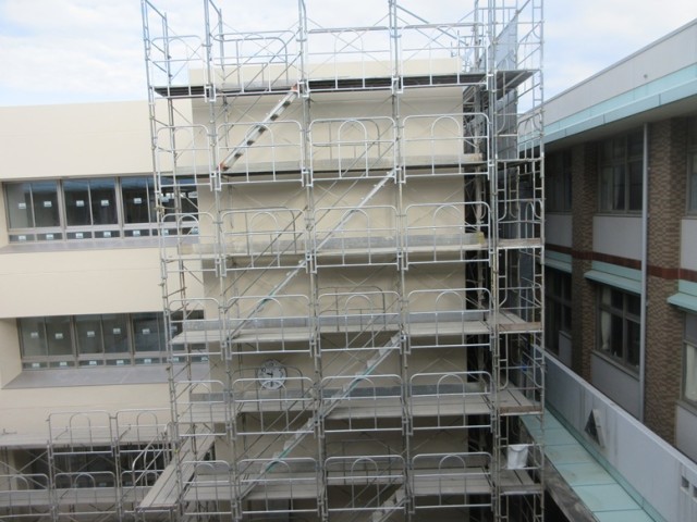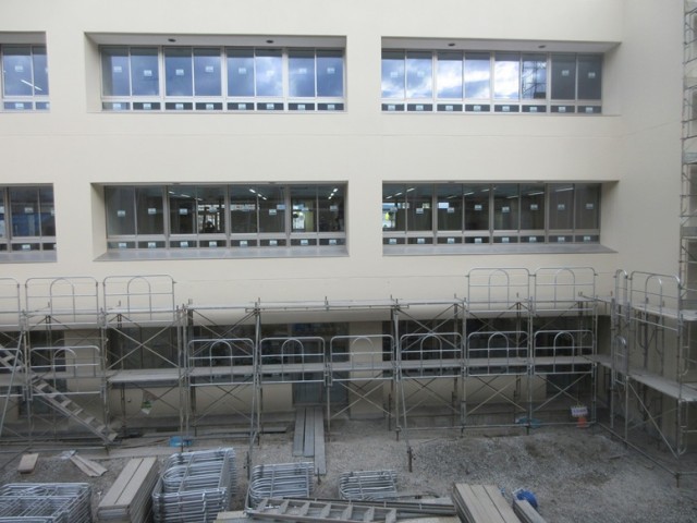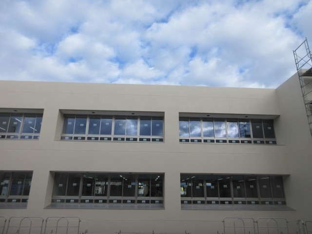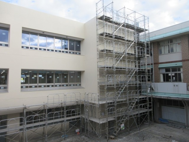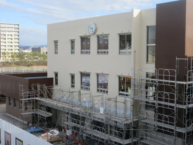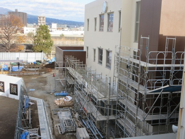 写真ではわかりにくいですが、運動場にはブランコも設置されました。足場が外され、図書館で学習していた3年生も「教室が見える!」ととても喜んでいました。