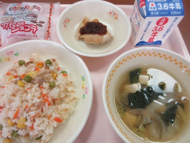 今日は2学期最後の給食です。献立はツナピラフ、鶏肉のオニオンソース、野菜のスープ、ガトーショコラ、牛乳です。