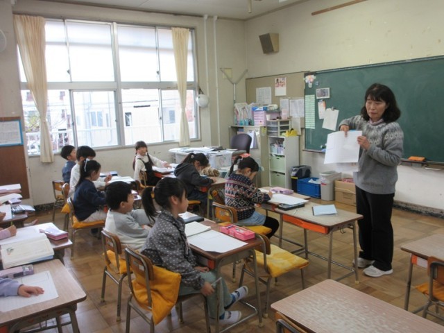 1年1組は、国語「のりものカードをつくろう」の学習です。先生から配られたプリントに自分の好きな乗り物をまとめていきます。どんな乗り物を選んだかな?