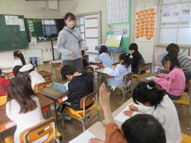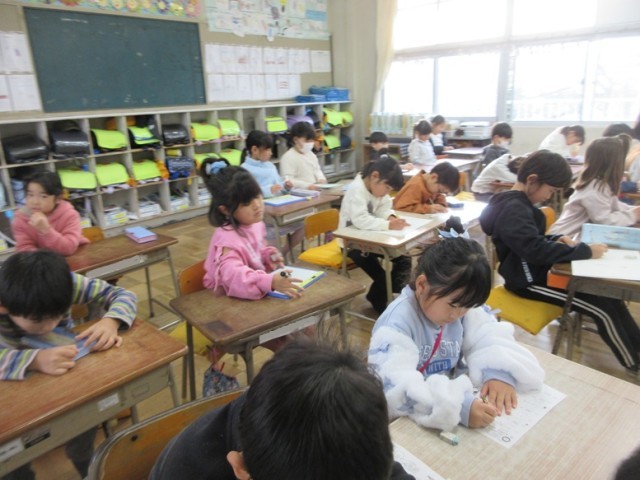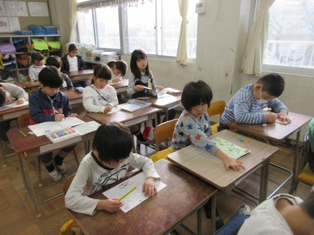 2組は、国語「漢字プリント」です。1年生もひらがなから始まり、カタカナ、漢字もお勉強するようになりましたね!とってもがんばってきました!