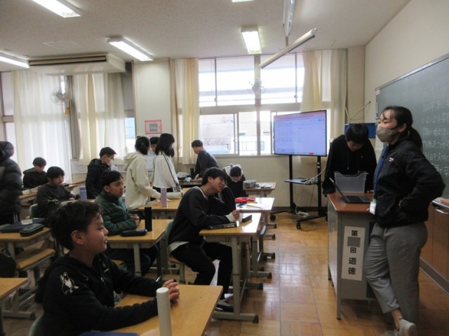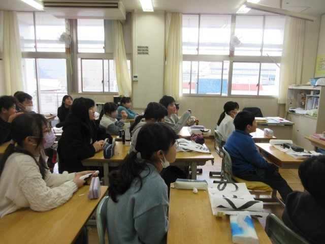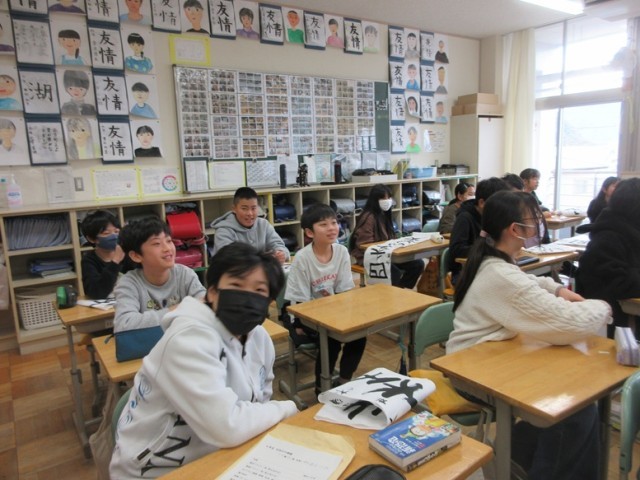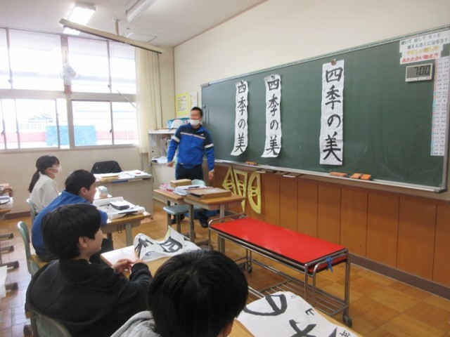 2組は、書き初めの課題の鑑賞と評価をみんなでしています。最後まで残ったのはどの作品でしょうか。全ての作品に頑張ってきた努力の跡が見られました。