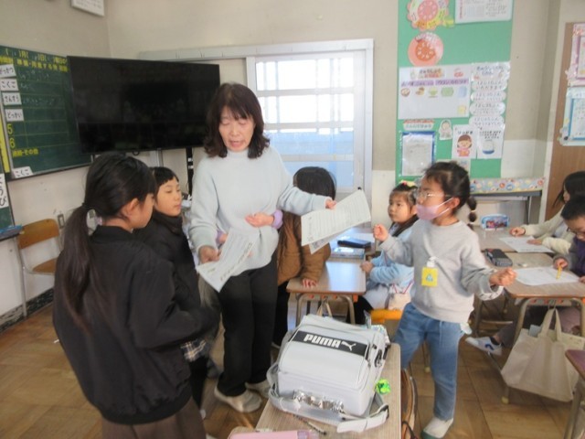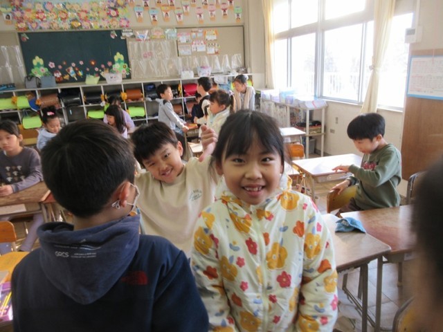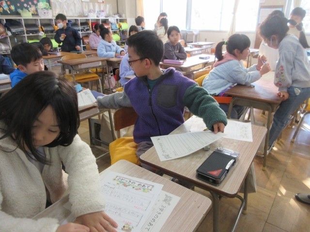 1年1組は、学活で「3学期のめあて」を考えています。2学期のめあてが返却され、達成できたこと、もっと頑張りたいことなどを考えています。「かん字をがんばりたい」「かかりのしごとをがんばりたい」「ろうかを走らない」と書いている子もいました。