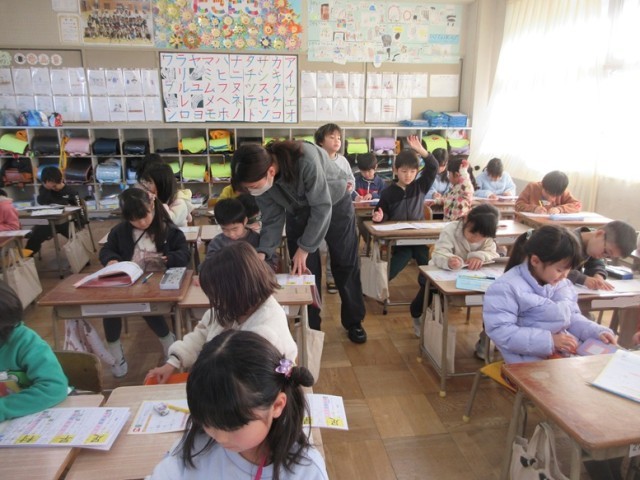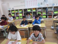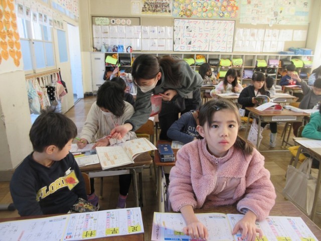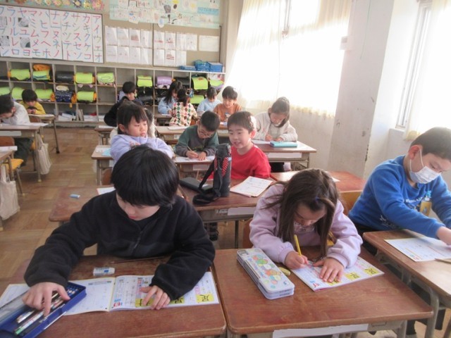 2組では、国語の「新出漢字」の学習です。漢字ドリルを使いながら、村・早・足の3つの漢字を練習します。できた子は、先生から丸をもらい、うれしそうな表情をしていました。