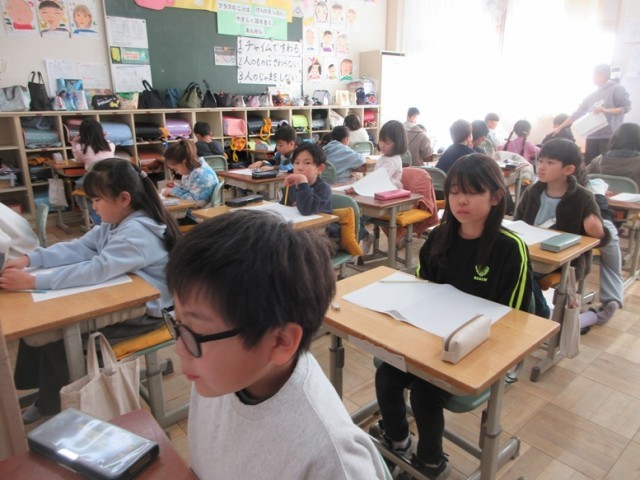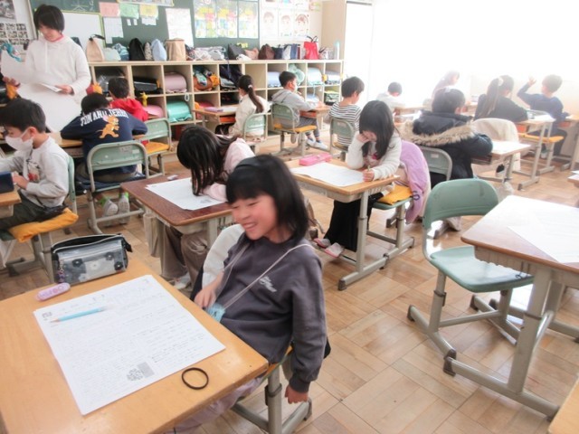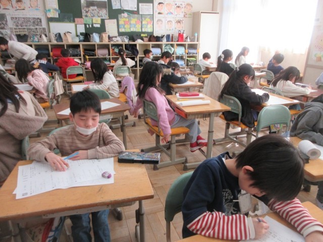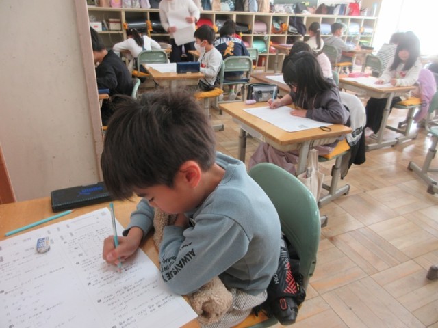 2年生は、2回目ですから取り組み方も要領を得ています。いつもより緊張している様子が伝わってきます。先生のお話を聞いて問題を解き、漢字の読み書きなどの問題に取り組み始めました。