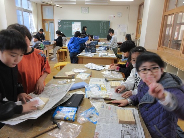 3年1組は、図工「トントン どんどん くぎうって」の学習です。最初に金槌やキリの安全な使い方についてのお話を先生から聞いた後、早速図工室中にトントントンというリズミカルな音が響き渡りました。どんな作品ができるか楽しみですね!
