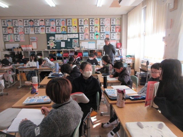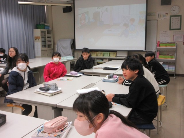 5年1組では、理科の学習です。今年の干支、午年から十二支を使った方角について学習していました。また、鬼のイメージなどについても話題に上がっていました。