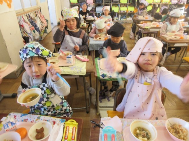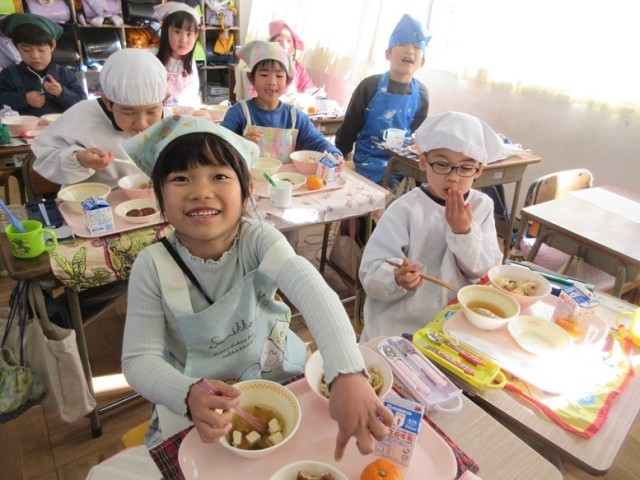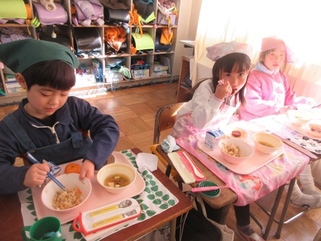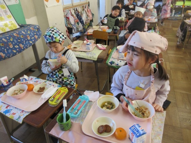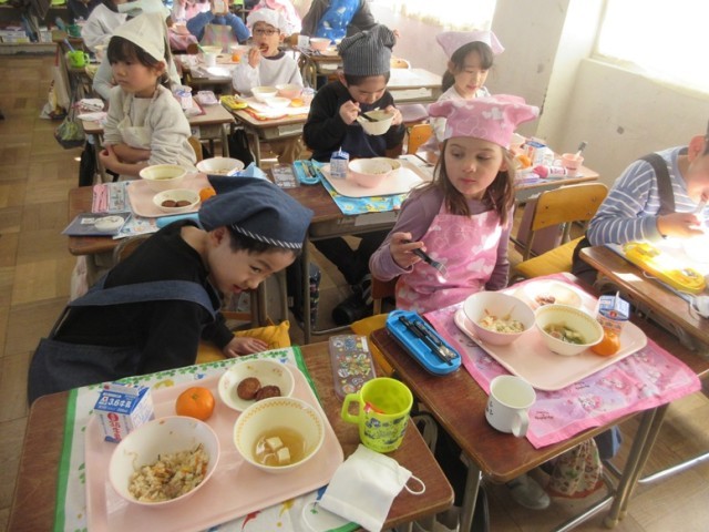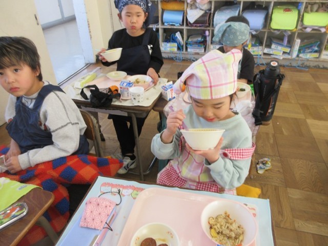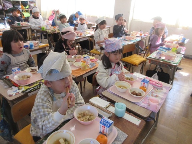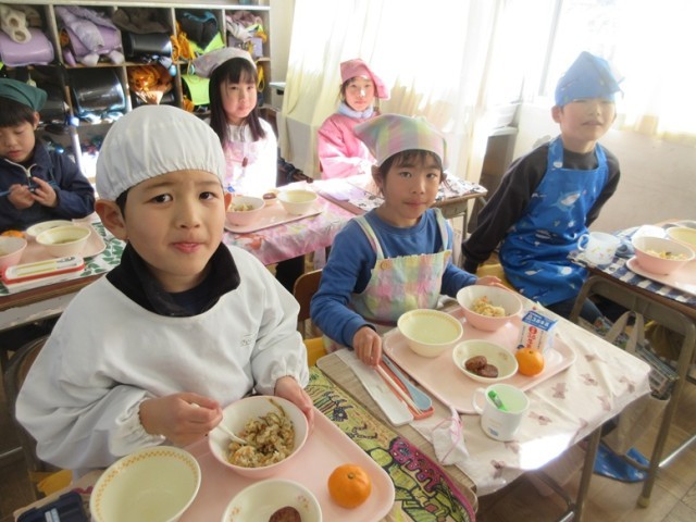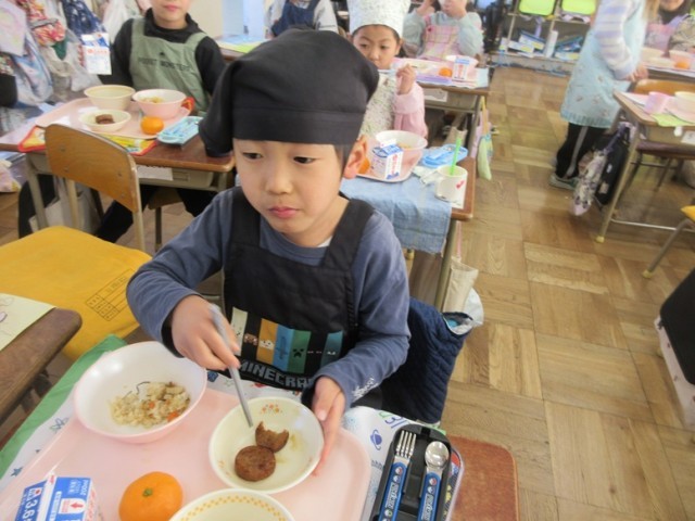 2組でもおいしそうに給食を食べています。お当番さんから「今日のおかわりは、ご飯は自由です。35分になったらみかんとつくねのじゃんけんをします」というお知らせがありました。炊き込みご飯はおいしいからたくさんおかわりしました。