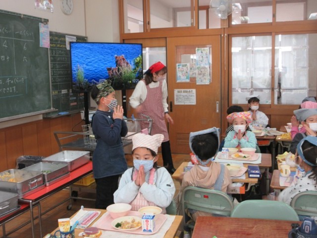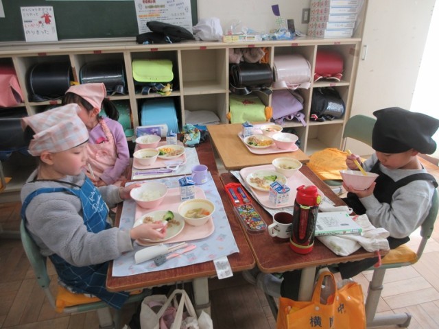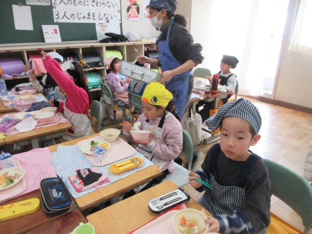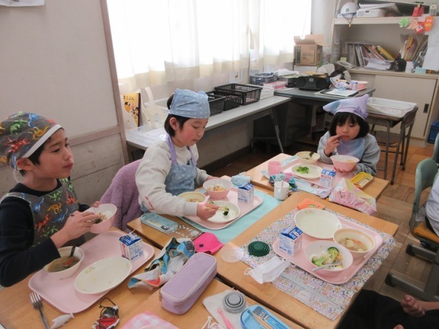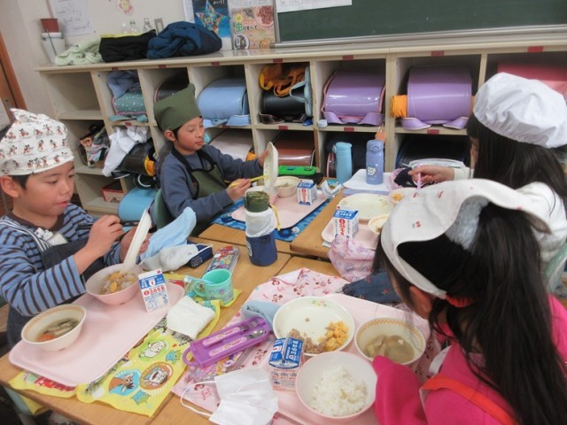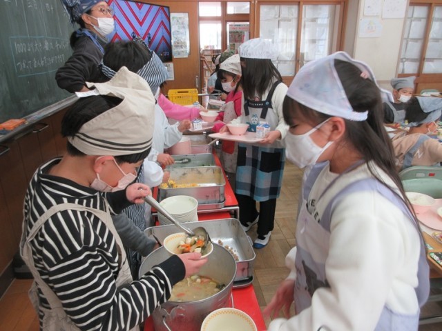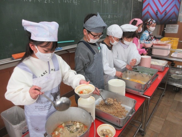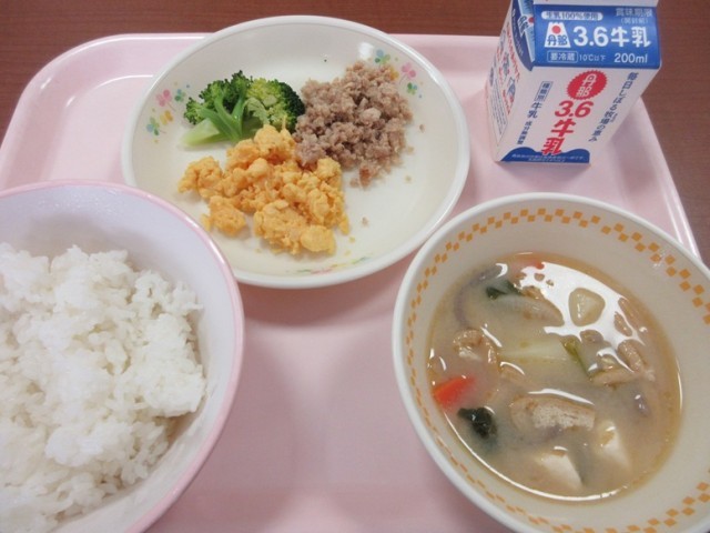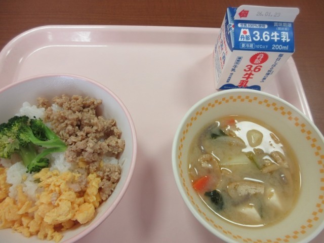 今日の献立は、二色そぼろ(たまご・肉そぼろ)、ゆでブロッコリー、ご飯、味噌けんちん汁、牛乳です。2年1組では、給食当番が配膳を手際よく行っています。みんな、早く食べたい様子が伝わってきます。三色ご飯にしておいしくいただきま~す!