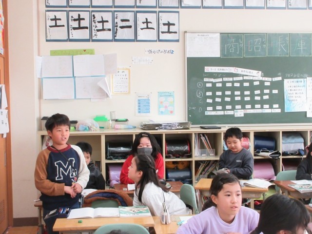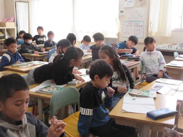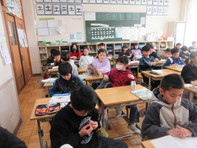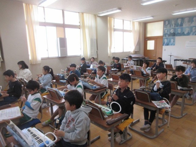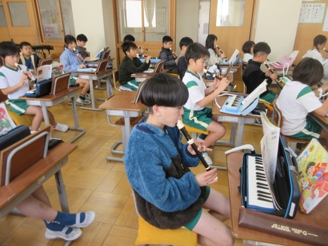 3年1組は、音楽「パフ」の学習です。上のパートとしたのパートに分かれて、リコーダーの練習をしています。「今、吹くところじゃないよ」とパートを意識して、友達に伝える子もいました。