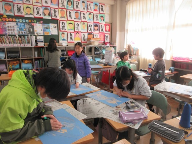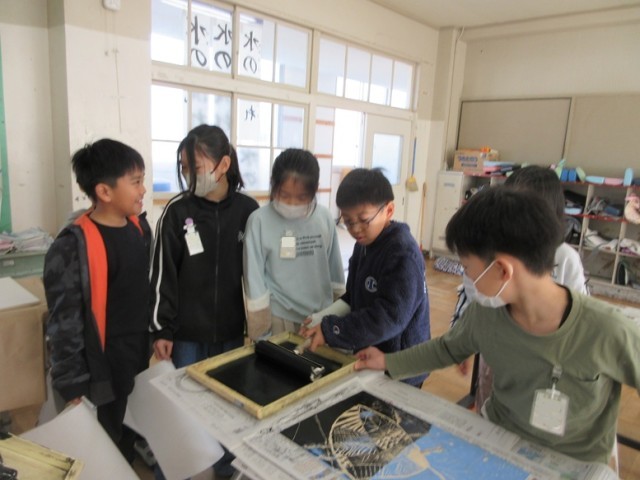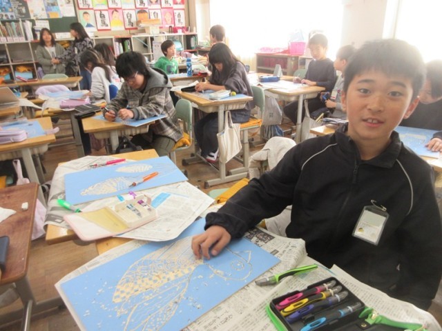 4年1組は、図工「木版画」の学習です。彫刻刀の種類や彫り方を変えながら、細かなところまで彫り進めています。彫り終わった子たちは刷る作業に入りました。どんな作品に仕上がるのか、インクをつけた後、紙を剥がしていく瞬間が楽しみですね。