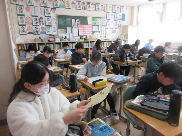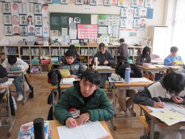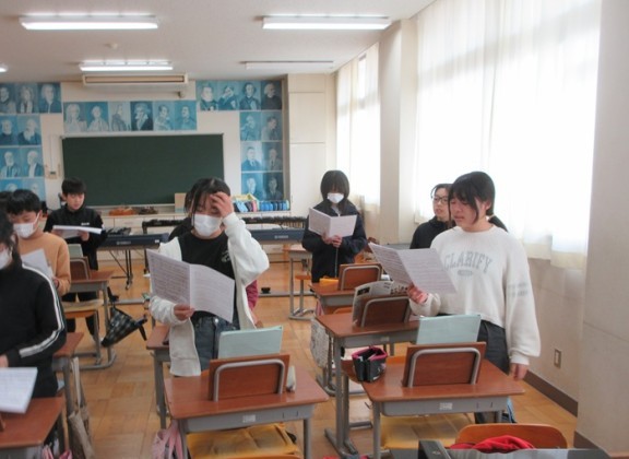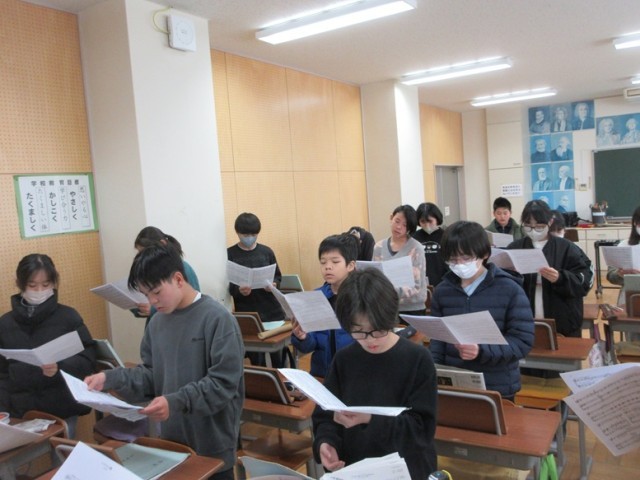 6年1組は、音楽で卒業式で歌う「いのちの歌」の練習に入りました。生きていることや人や友達との出会いに感謝する歌なので、気持ちを込めて練習しています。