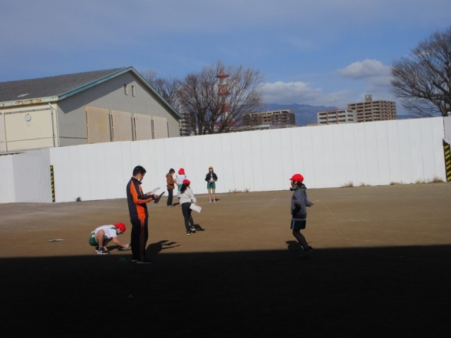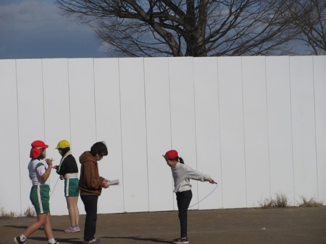 7の1組は、外で体育の縄跳びです。みんなでできる技を増やしています。風が強かったけれど、一生懸命練習しています。
