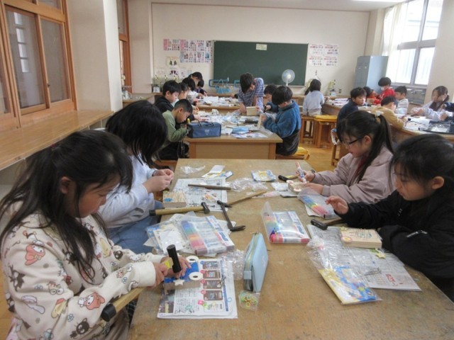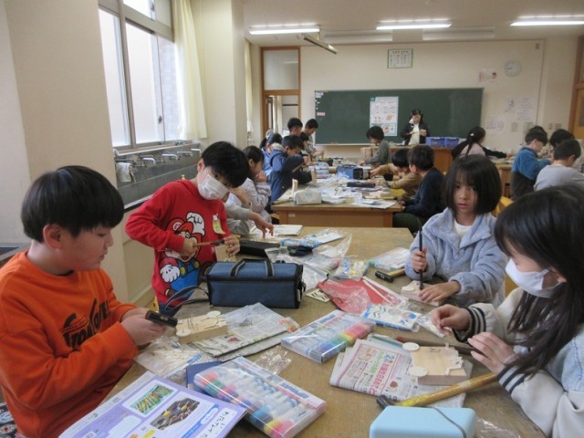 3年1組は、図工「ドンドンどんどんくぎうって」の学習です。その名のとおり、図工室はトントントンと釘を打つ音でいっぱいです。カラー輪ゴムをつけたり、色を塗ったりしながら飾り付けです。