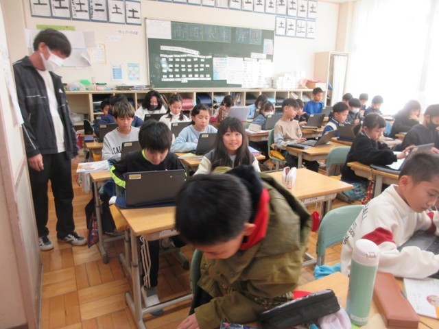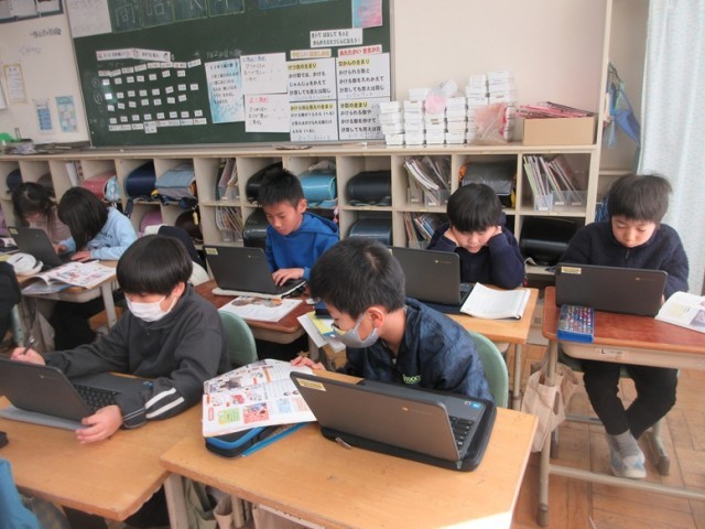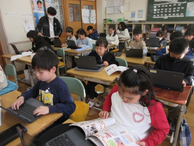 2組は、社会科で警察や救急などについて学習しています。「通信司令室」とはどのようなものなのかをChromebookで調べています。どんなことがわかったかな?