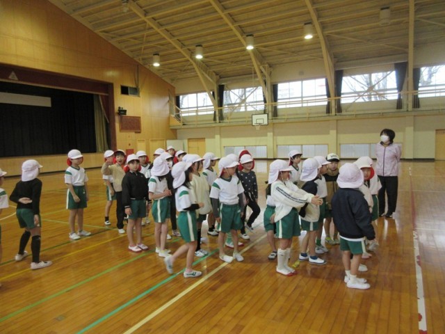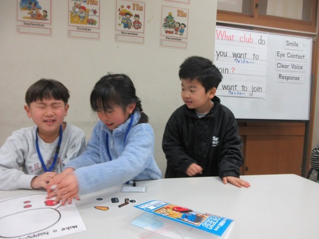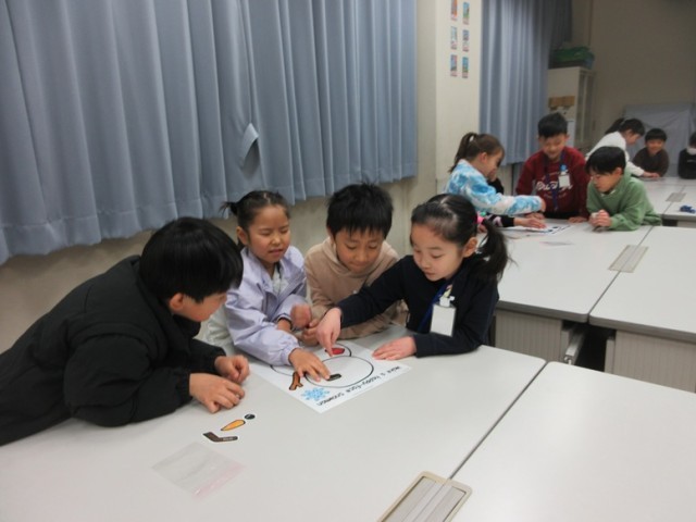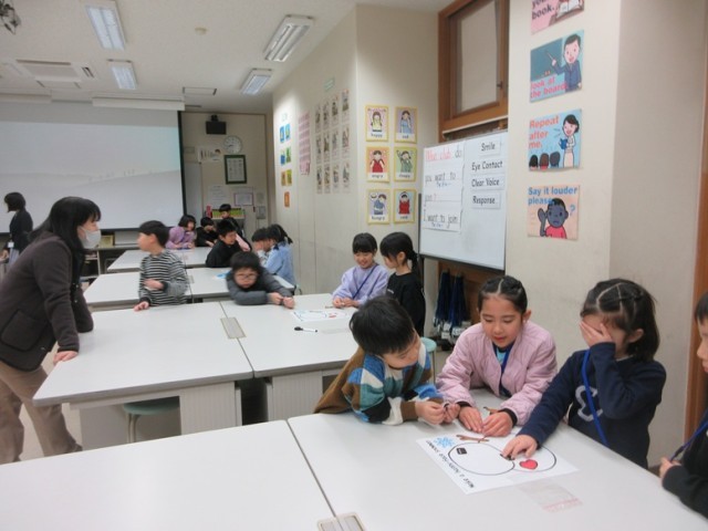 2年1組は、英語の学習です。最初に、スノーマンの福笑いをしました。「アップ!アップ!」「ライト!ライト!」など、指示する子たちも大声で盛り上がっています。みんなで楽しく学習しています。