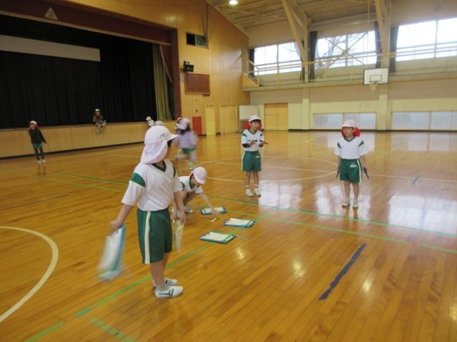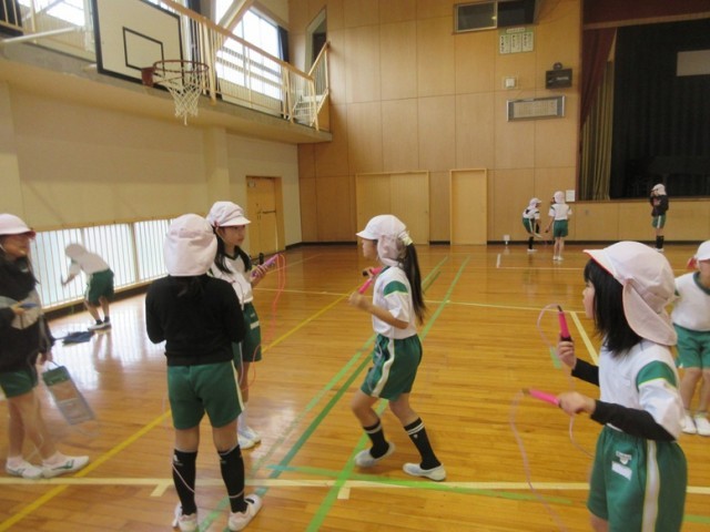 2組は、体育館で体育です。今日の目標は、①7級合格を目指す ②来週行われる二重跳び大会の練習をする です。友達と見せ合いをしながら縄跳びカードを進めています。