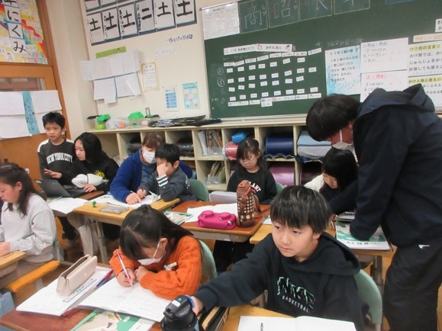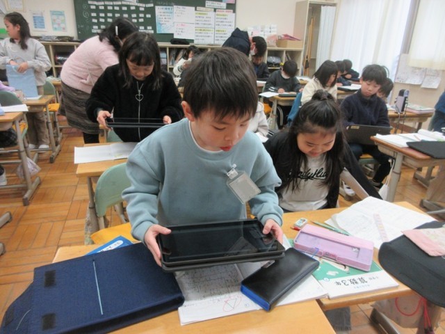 2組は、算数3桁×2桁のかけ算の学習です。自分の考えをノートに書き終えた子は、ノートを写真に撮り、ロイロノートで先生に提出しています。