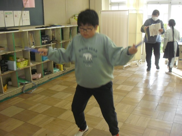 7-2組はなわとびを行っていました。できるようになった技を先生に見てもらっていました。
