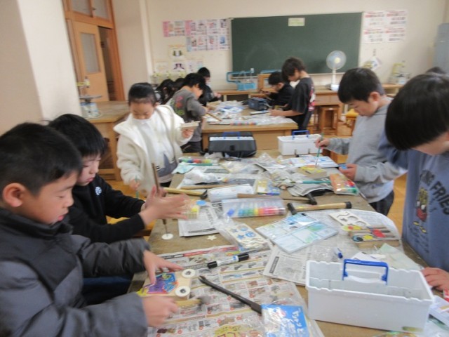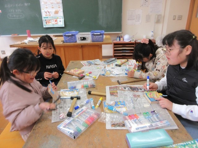 3年1組は、図工「トントンどんどんくぎうって」の学習です。打った釘に輪ゴムを掛け、ビー玉をはじいて遊ぶゲームになってきました。「ここに入ったら○点だよ」と教えてくれる子もいました。
