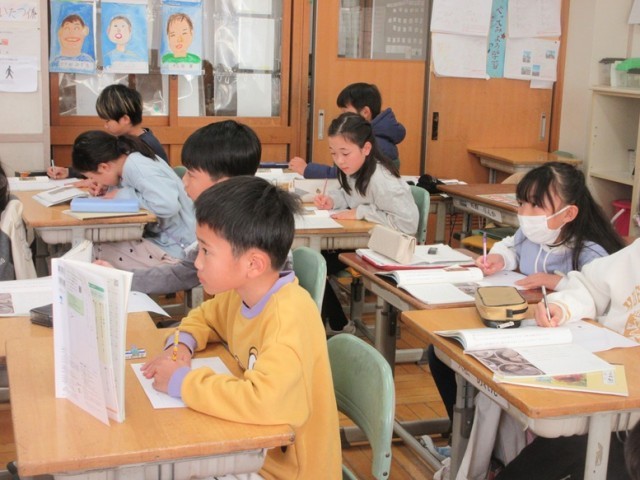 2組は、国語「カミツキガメは悪者か」の学習です。問いの文と答えの文を手がかりに、何を伝えたいのかを考えています。