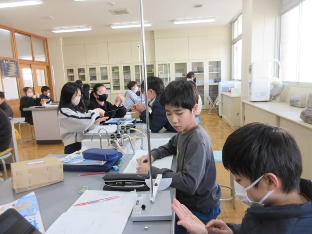 5年1組は、理科「振り子」の学習です。おもりの重さや振れ幅などについて、実験しています。きまりを見つけることができたかな?