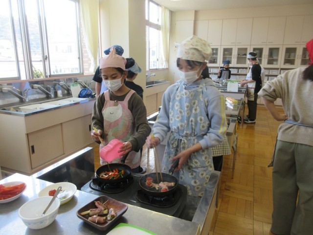4時間目に6の2の子が校長室に調理実習で作ったベーコン巻きを持ってきてくれました。コショウも効いていて「うまい!」と思わず声が出るほどでした。家庭科室に行くと、おいしそうな匂いでいっぱいでした。どのグループも協力しながら調理、片付けなども行っています。栄養教諭の先生もアドバイスしてくれていましたね。今日やった調理実習を家庭でも実践してみてくださいね。(もちろん保護者のいるところでの火の扱いにしてくださいね!)