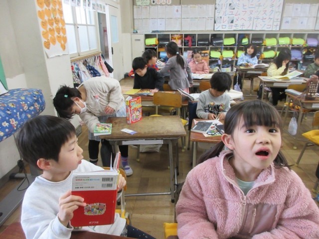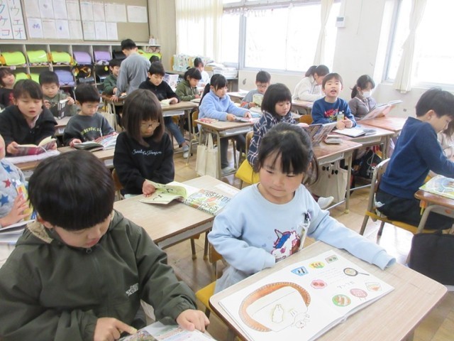 2組は、読書指導です。図書館で読みたい本を借りました。さっそく借りてきた本を読んでいます。