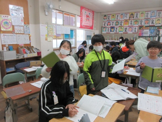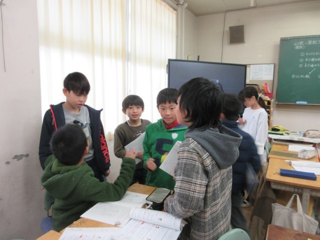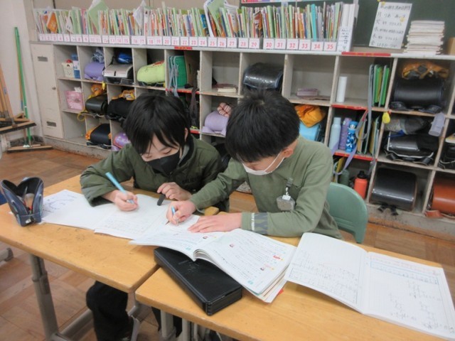 4年生は、1,2組とも算数で、「あまりのあるわり算の筆算の仕方」と「割り切れないとき、どうやって計算するのか?」という学習課題に取り組んでいます。1組では、解けた子がミニ先生になって互いに教え合っていました。2組では、「がい数」というキーワードが出てきました。