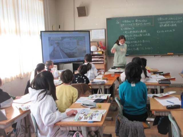 4年1組は、社会科「川根町は南アルプスの自然をどのように生かしているか?」という学習課題について、映像を見ながら考えています。自然を生かす、自然を守るの両面が必要なことを学んでいました。