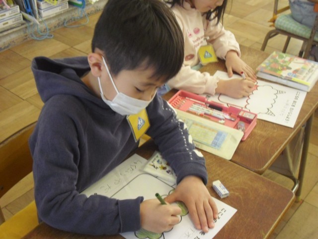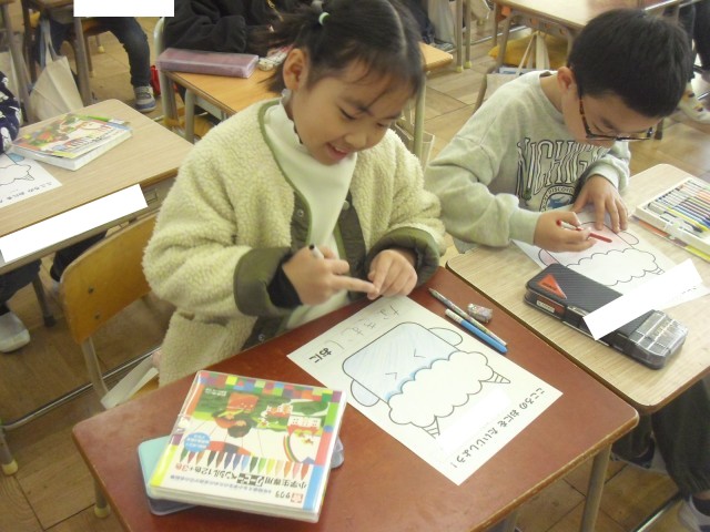 1年生は生活科で「どんなおにをたいじしようかな」の学習でした。