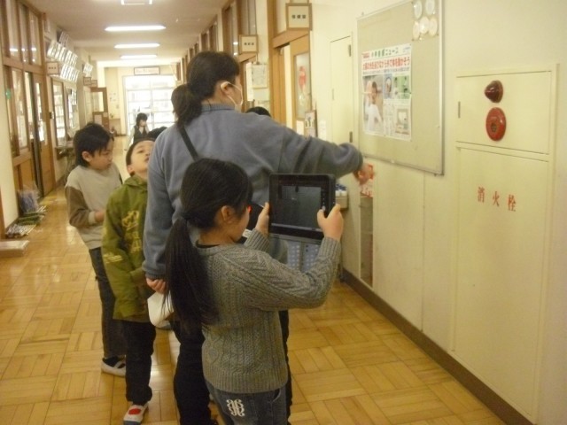 実際に学校中を探検し、学校には、防災監視盤や消火器、消火栓、防火扉などたくさんの設備が整えられていることに気付いていきました。