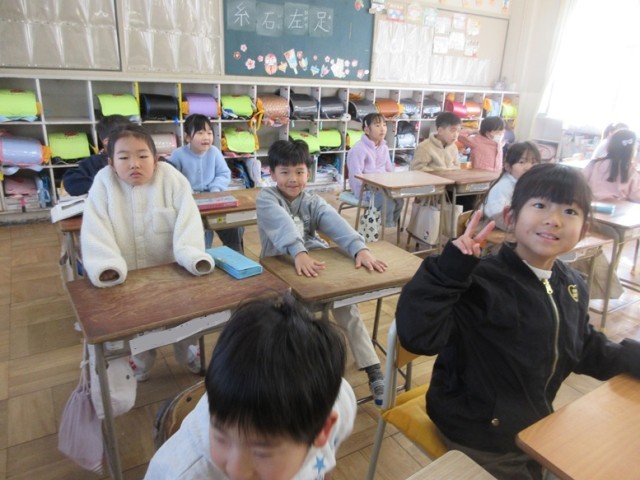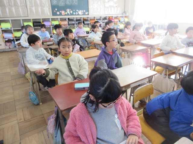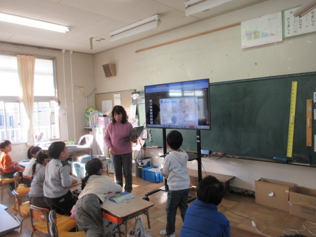 1年1組は、読解「学校はたのしいよ」という学習です。「みんな、去年の今頃、小学校に入る前って不安なことあった?」と先生。「あったよ」とみんな。「では、2年生になるみんなに、今度入学してくる子たちに学校は楽しいよって教えてあげましょう」と先生。たくさん、楽しいこと教えてあげたいね。