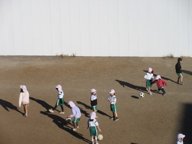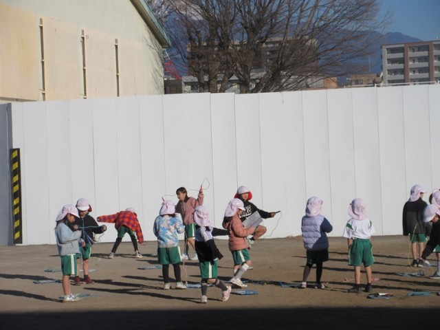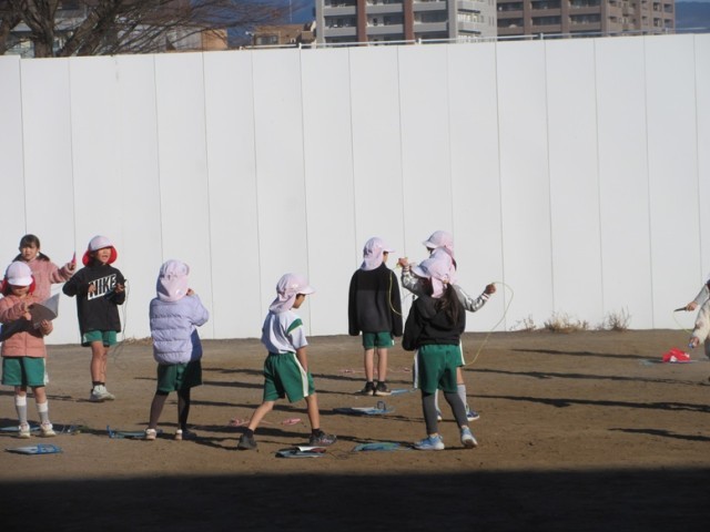 2組は、外で体育です。寒さに負けず、元気よく縄跳びとボールけり遊びをしています。