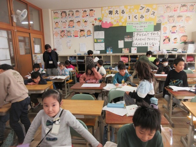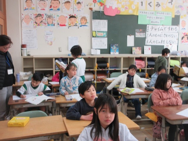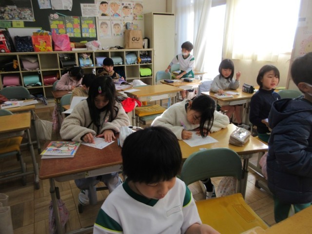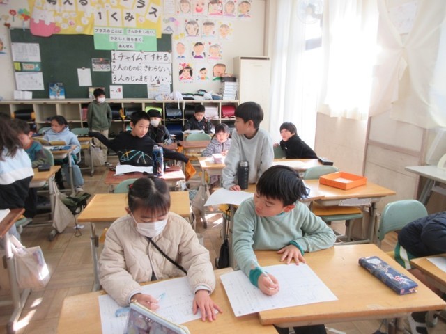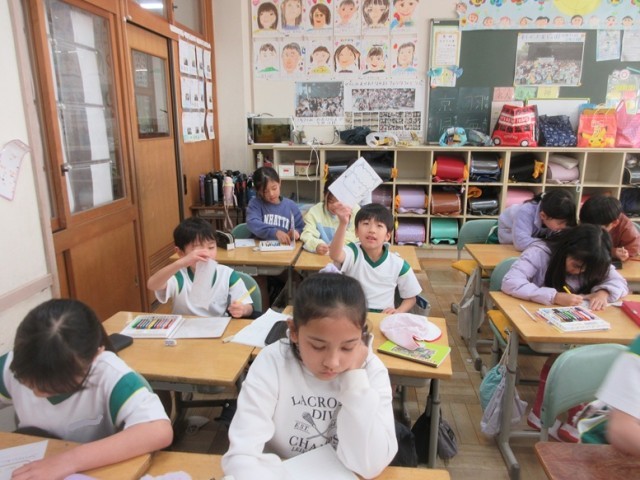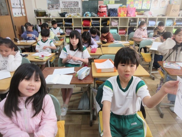 2年1組は、国語「比べてつたえよう」の学習です。「まず」、「次に」など、分と分をつなぐ言葉を使いながらまとめています。