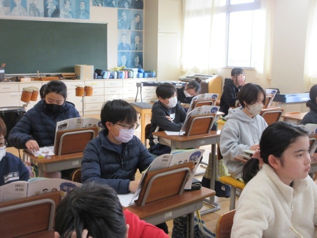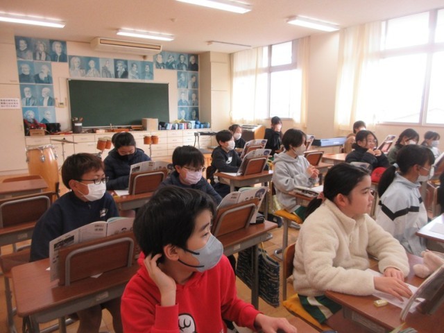5年1組は、音楽「子守歌」の学習です。日本の旋律の美しさを味わいながら聞いています。「沼津の子守歌って知ってる?」と先生。「…?」とみんな。みんな、必ず聞いているはず。どこで聞いているかな?
