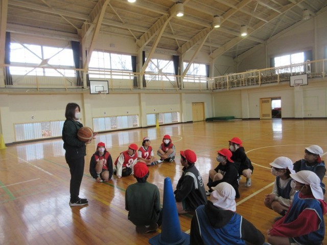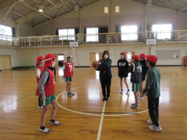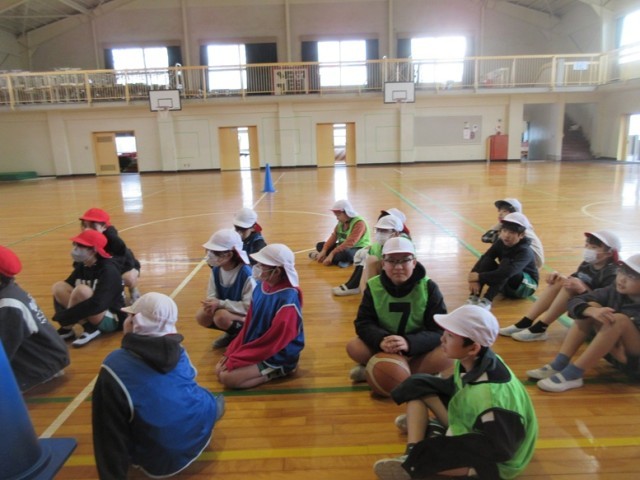 2組は、今日からバスケットボールの学習がはじまりました。ルール、特にファウルの確認をしています。その後、試しのゲームに入りました。