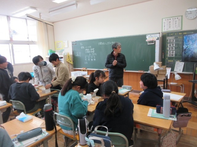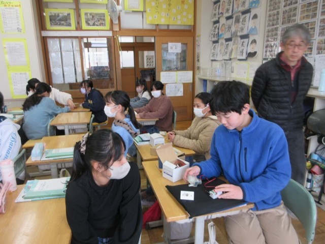 2組は、理科「豆電球とLEDの違い」の学習です。手回し発電機を使って試しながら考えています。