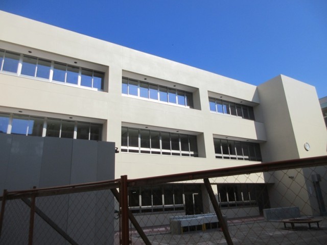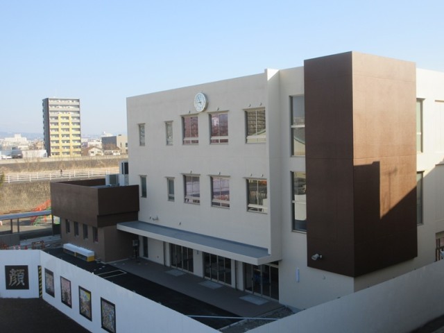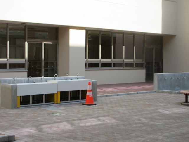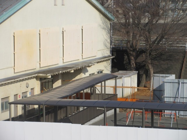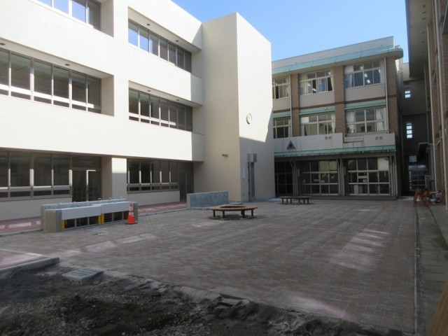 いよいよ新校舎も完成が近づいていきました。体育館までの渡り廊下のサイドの部分もできあがってきています。中庭のレンガも大分敷き詰められました。