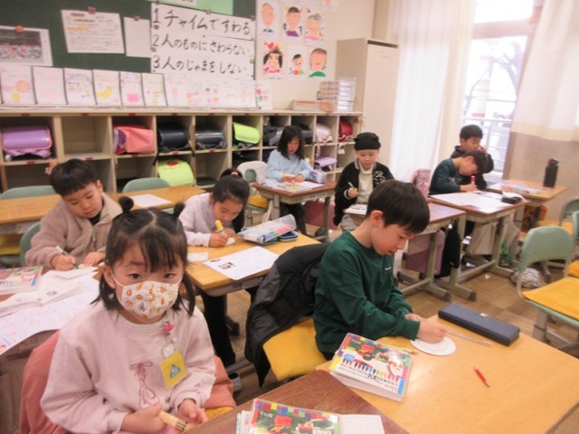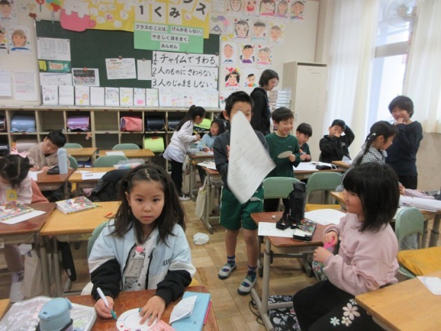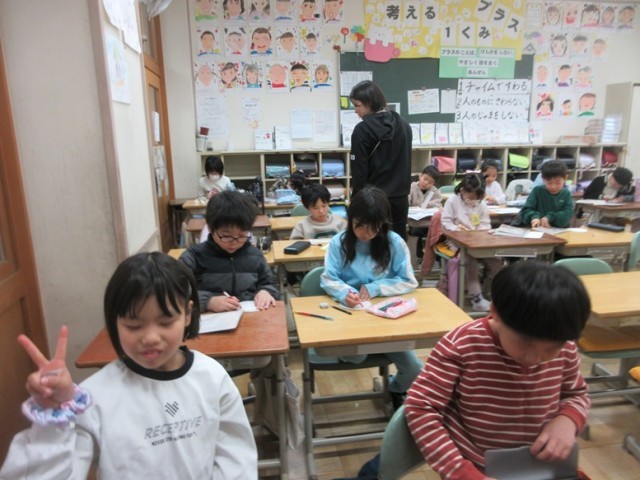 2年1組は、国語のテストが終わり、六送会のためのメダル作りをしていました。6年生とのお別れの日も近づいてきていますね。