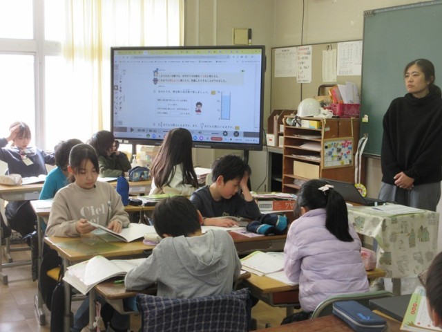 4年1組は、算数のまとめの学習です。「考え方モンスター」を使って、みんなで、分母が1の分数について考えています。