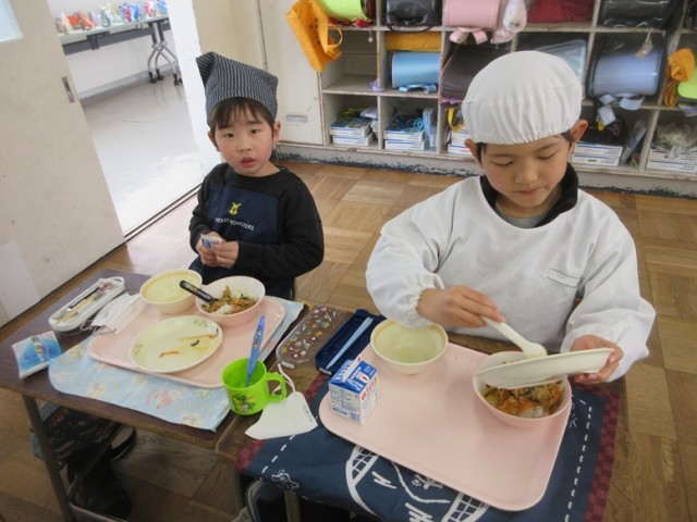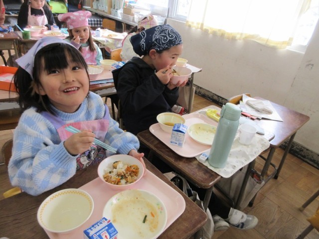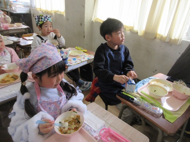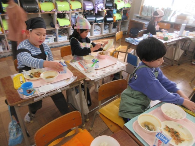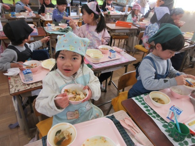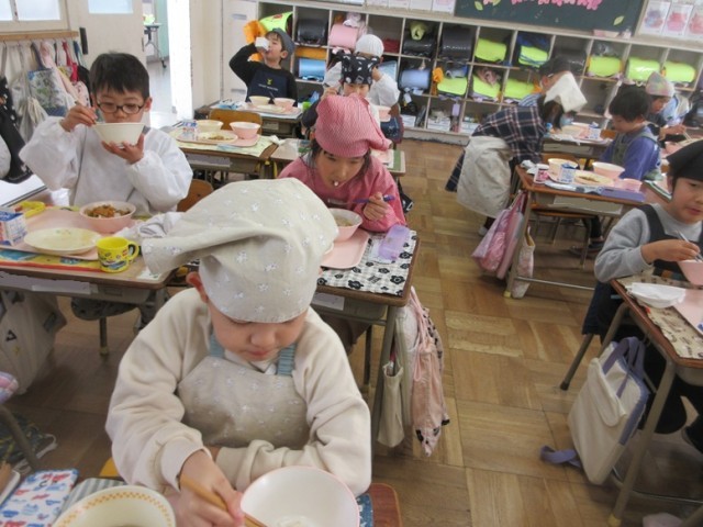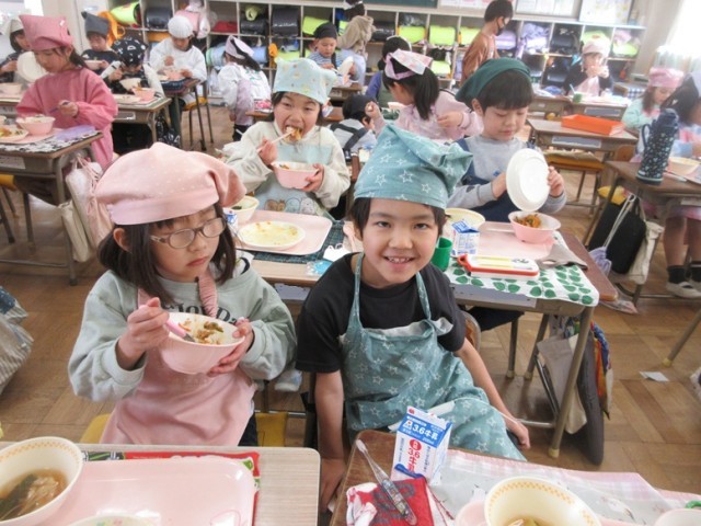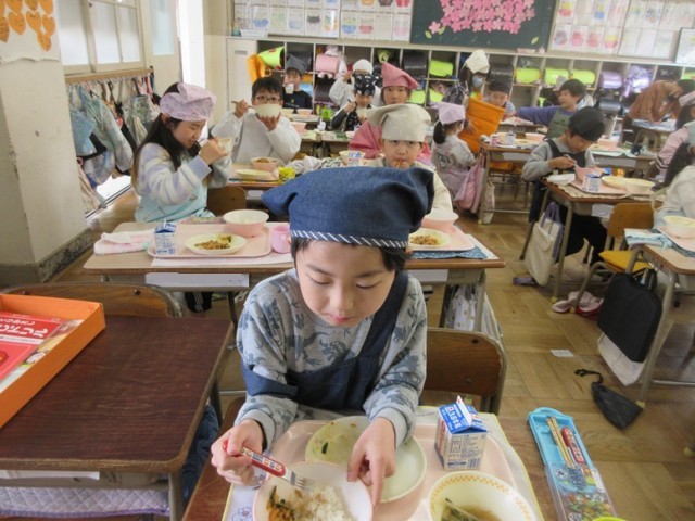 1年2組でも、豚キムチとワンタンをおいしそうに食べていました。「朝もワンタンスープだったんだよ!」と教えてくれる子もいました。1年生もしっかりとした食べっぷりになってきました。
