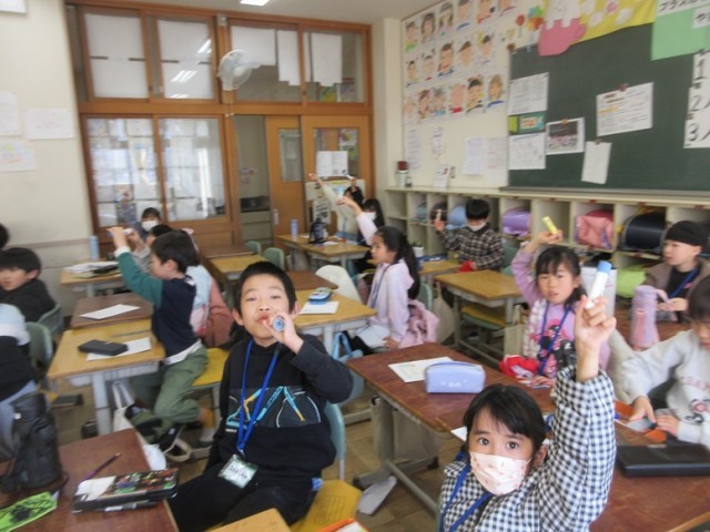2年1組は英語で「文房具」について学習しています。スティックタイプののりと水のりタイプののりは、どんなふうに言い換えるか分かったかな?身近にある文房具の英語での言い方を楽しく学んでいます。