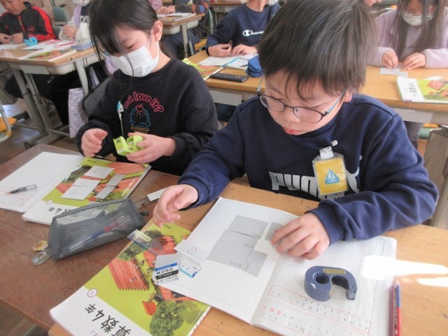 今日、出会った「展開図」という言葉から、直方体をつくる展開図にはどんなきまりがあるのかを、操作活動を通しながらきまりを見つけていく授業でした。「こうしたらできる」「こうなっているとできない」と具体的にきまりを見つけていくことができました。それぞれがいろんな展開図を作りました。