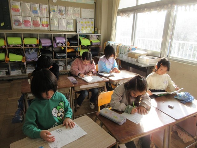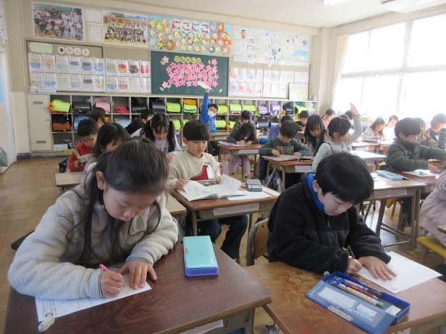 2組は国語「小学校のことをしょうかいしよう」の漢字ミニテストです。1年生で習うべき漢字をしっかり身につけてほしいと思います。