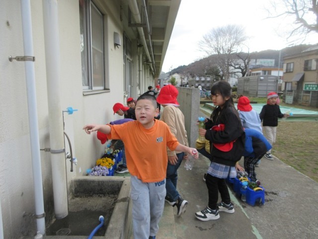 1年1組は、朝のお花の水くれです。「見て見て!○○さんのお花すごいよ!」「いい匂いがするんだよ!」とたくさんの子たちが育てている大切なお花について話してくれました。