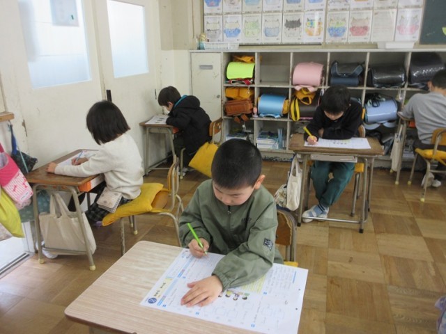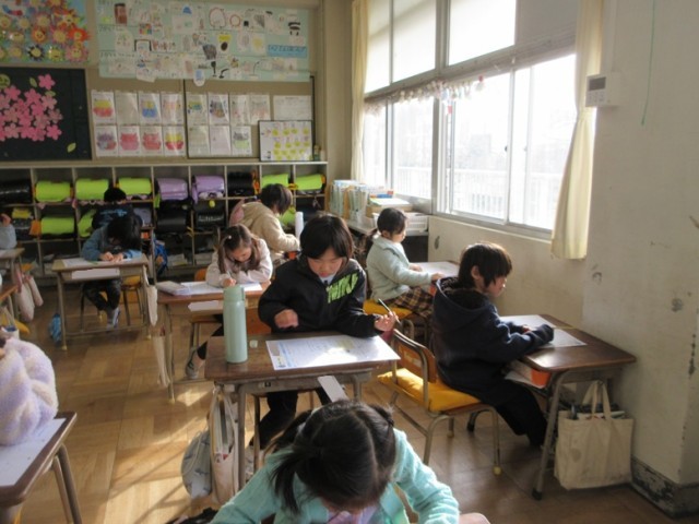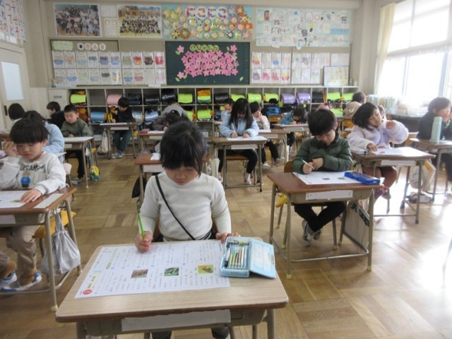 2組は、国語「学年のまとめ」のテストです。説明文を読んで答えたり、漢字の読み書きを答えたりします。文章も読み取る力がついてきています。